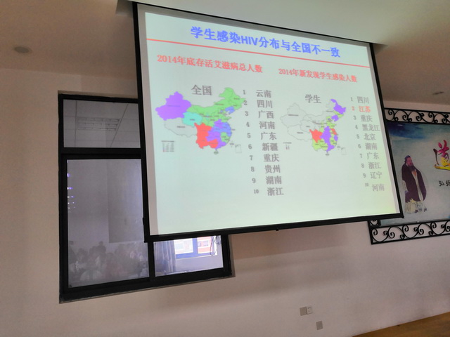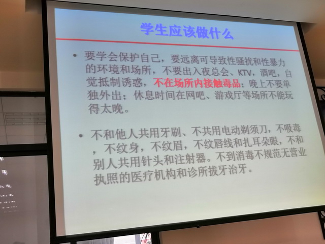 张科长通过图片向同学们展示了艾滋病高发区在我国的分布情况、艾滋病的传播途径及预防艾滋病所应采取的措施。他还对具体案例进行了分析,同学们通过案例进一步了解了艾滋病的严重危害、艾滋病毒感染人体的过程——它是破坏人体免疫系统,让人体失去对外界的抵抗力,直到感染全身至死亡;张科长对艾滋病的传播途径也进行了细致讲解,要求同学们做到有针对性的防控。他特别强调学生在预防艾滋病应该怎么做,要学会保护自己,形成健康行为方式,有效预防和控制艾滋病的传播。要求学生要远离可导致性骚扰和性暴力的环境和场所,不出入夜总会KTV,酒吧,自觉抵制诱惑,不在场所内接触毒品。晚上不要单独外出,休息时间,不要去网吧,游戏厅玩。不和他人共用牙刷,电动剃须刀,不吸毒,不到消毒不规范无营业执照的医疗机构和诊所拔牙治牙。