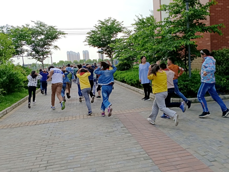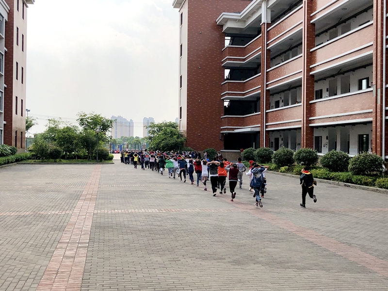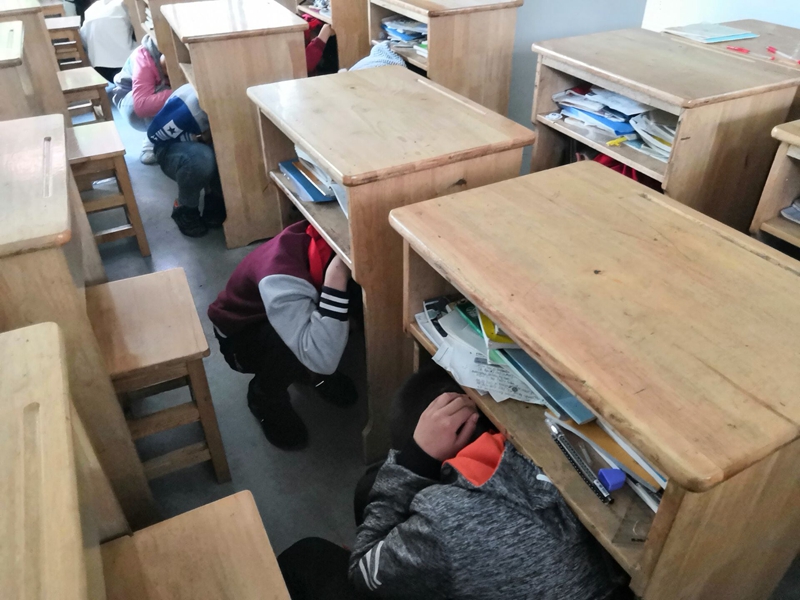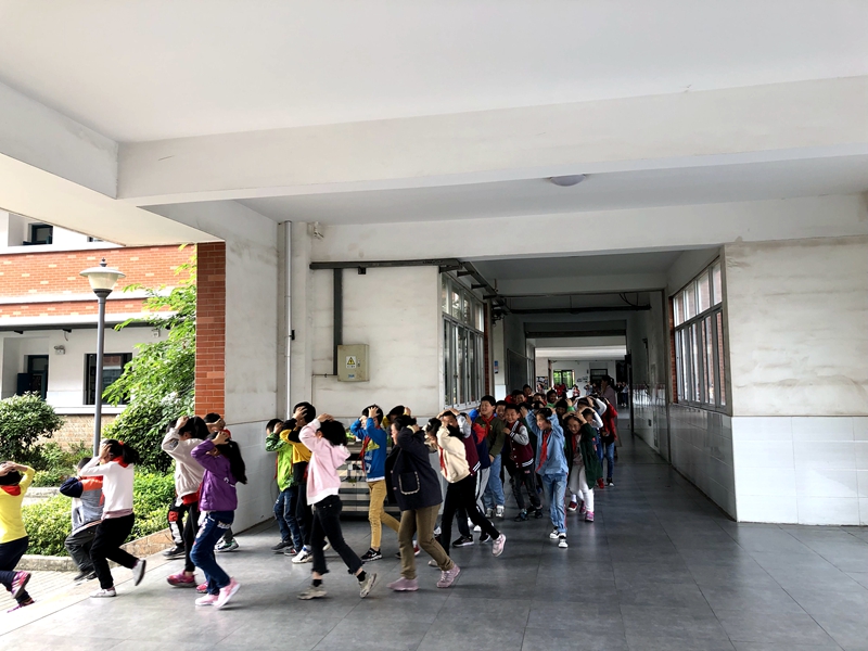 5月10日下午2时30分,急促的警报声突然响起,打断了原本平静的校园,各楼层负责教师快速到达指定岗位,正在上课的老师们迅速告知学生:“地震来了,不要慌,请赶快躲藏!”并组织学生选择安全地点就近躲藏。学生们有的用书本、书包护住头部,有的钻到桌子下,有的蹲在墙角边。当第二次报警声响起,各任课教师组织学生开始撤离教室,学生双手护头,沿着预定路线快速有序地向平坦空旷的操场紧急疏散,并在指定的安全区域集合。两千余名师生,撤离时间为1分51秒,学生认真对待,紧张而不慌乱,快速而有秩序,起到了预期的效果。