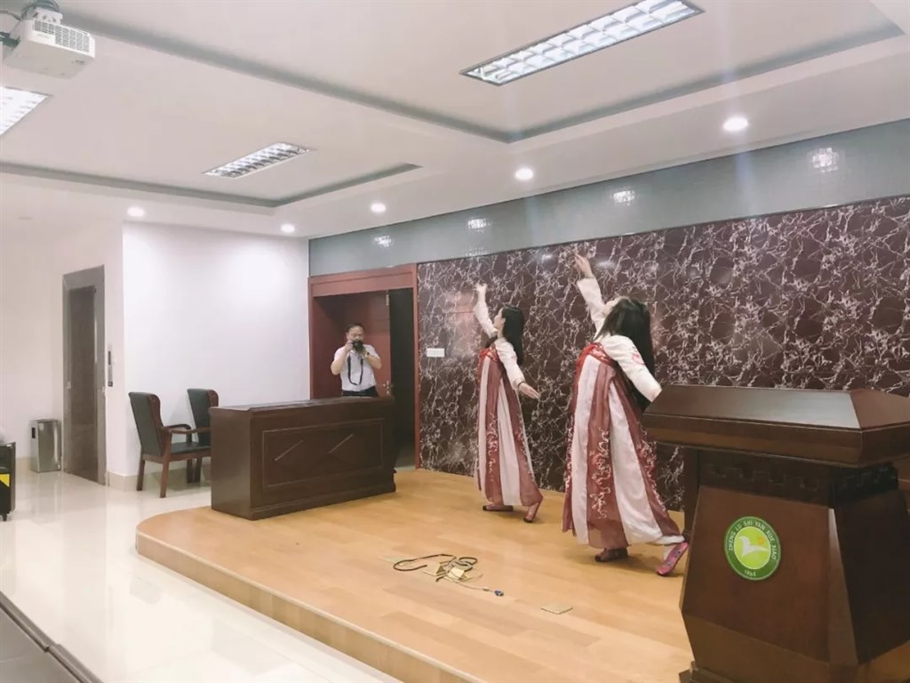 赏古典舞蹈。优美的舞蹈表演开始啦!表演者曲裾深衣,舞姿轻盈优雅,充满了古典特色,将学生们引领进了更深的文化体验之中。