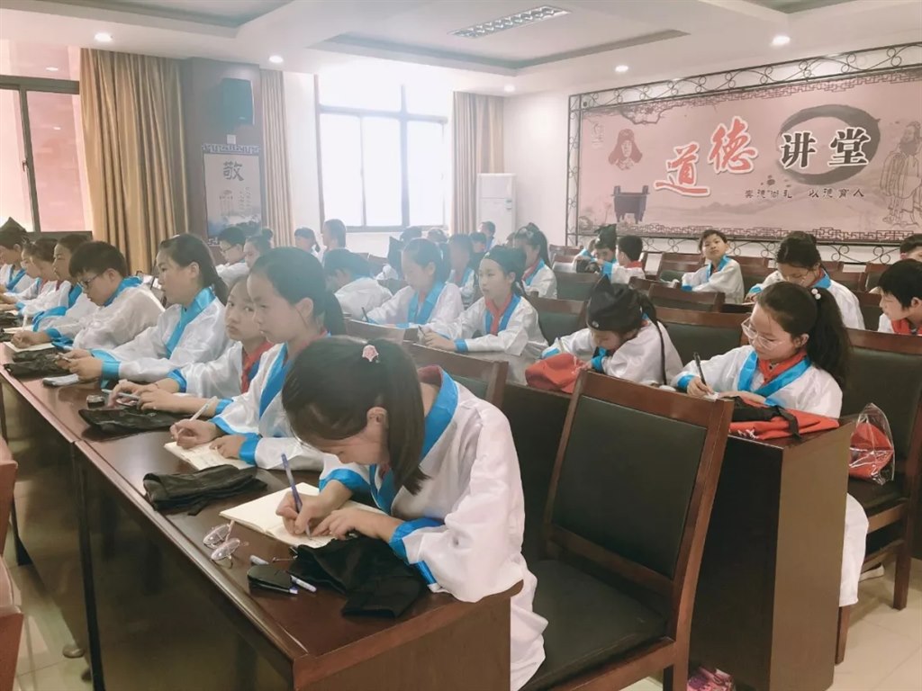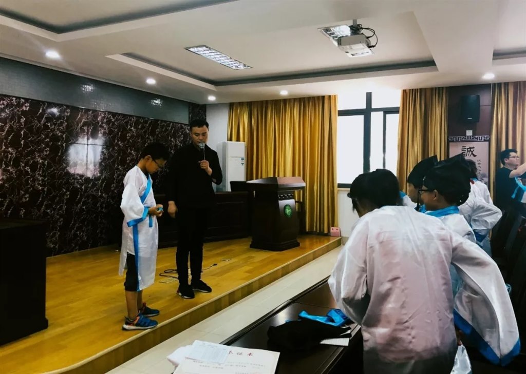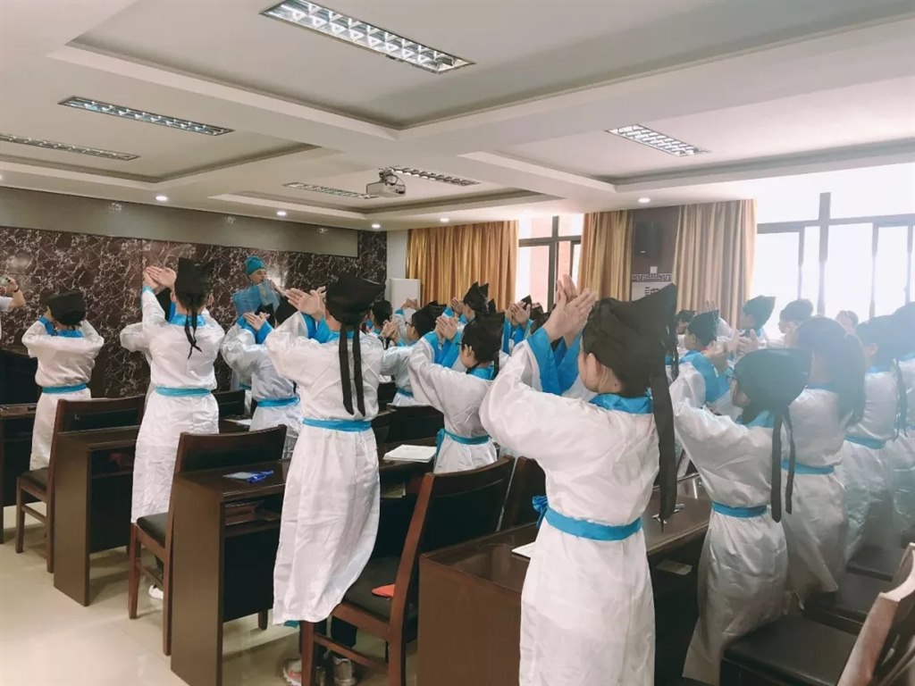 学古礼,知孝悌。学生们随老师学习古代礼仪,学得有模有样,正像是一位位谦谦君子呢。