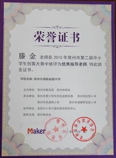 滕金老师在2015年常州市第二届中小学生创客大赛中被评为优秀指导老师