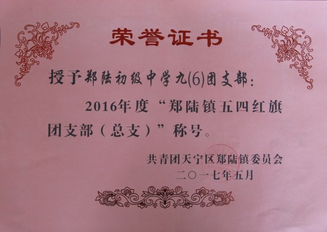 郑陆中学九(6)团支部被评为2016年度“郑陆镇五四红旗团支部”称号