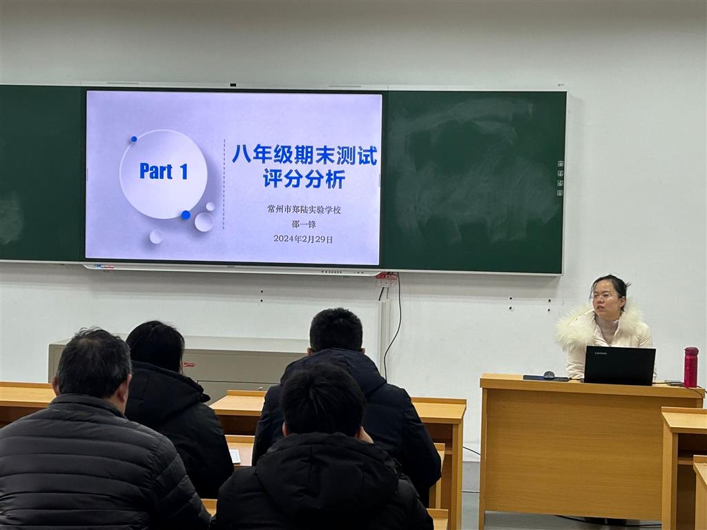 首先常州市郑陆实验学校的邵一锋和李晓兰两位老师分别对八、九年级期末测试进行分析,从得分率、知识点、错误原因等方面分析,总体来说,学生的审题能力有待加强,惯性思维比较严重,公式的灵活应用、单位换算的能力需提高。然后对作图题、计算题如何赋分做了具体的指导。李晓兰老师还对教师的教学提出了要求,填空题、解答题答题要规范,力学、光学、电磁学三个板块提出了中考的相关要求。