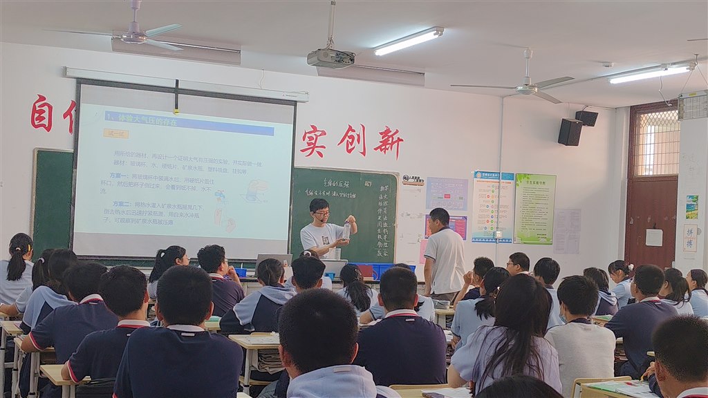 焦溪初级中学的张永老师语言精练严谨,从多个角度带领学生探究了大气压强的产生和如何估测大气压强。其中的例题和实验改进环节提升了学生思维高度,培养了学生的科学探究能力。