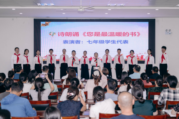 七年级学生代表以一首深情的诗朗诵《您是温暖的书》,表达了对老师们深深的感激与祝福。真挚的语言、动人的演绎,赢得了全场阵阵掌声。