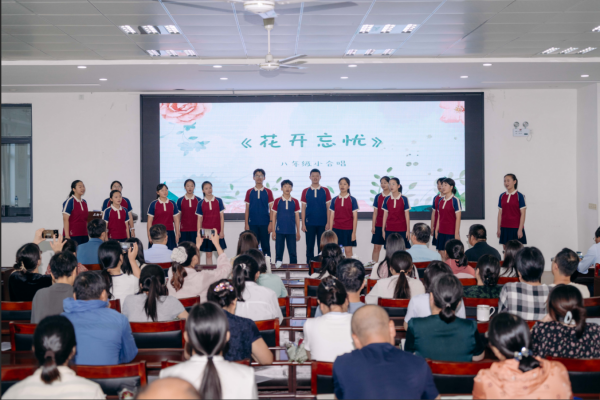 八年级学生代表献上小合唱《花开忘忧》,用清澈的歌声传递对老师的美好祝愿。