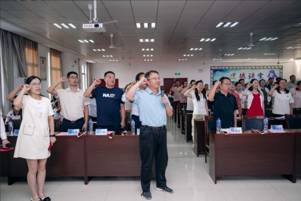 接着沈爱国副校长带领全体教师庄严宣誓。铿锵有力的誓言回荡在会场中,彰显出老师们坚守教育理想、恪守师德规范的坚定决心。