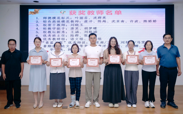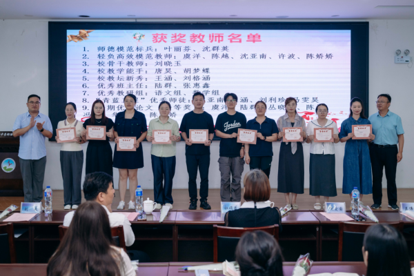 颁奖环节中,薛冬生副校长宣读了各类获奖教师名单,校级领导依次为获奖教师颁发奖状。师德模范标兵、轻负高效模范教师、骨干教师、优秀班主任、教学能手、教坛新秀、优秀教研组、“青蓝工程”优秀师徒、优秀论文(案例)等多个奖项,充分肯定了老师们在各自岗位上的卓越贡献。