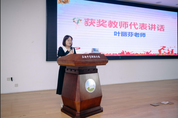 获奖教师代表叶丽芬老师发言。她结合自身从教经历,分享了教育路上的心得与感悟,表达了对教育事业的热爱与坚守。